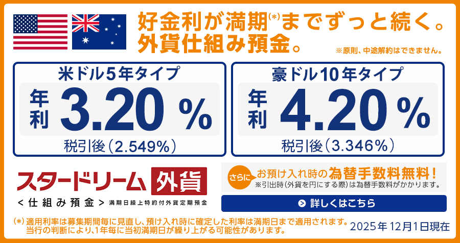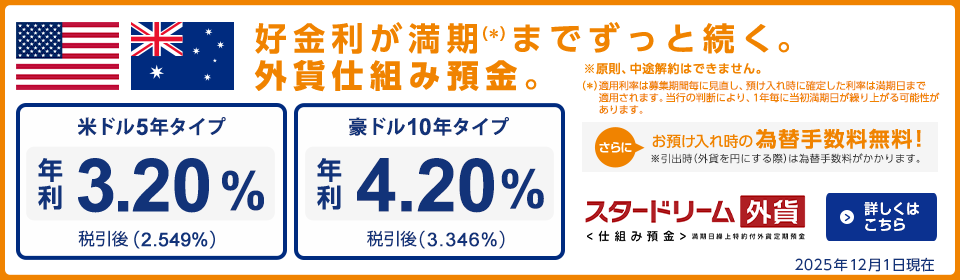 - スタードリーム外貨定期〈仕組み預金〉は、原則、中途解約はできません。例外的に当行がやむを得ないと認めて中途解約に応じる場合、違約金が差し引かれ、結果として元本割れが生じます。また、外貨預金には、為替変動による為替リスクがあります。商品説明書をよくご確認の上、ご自身の判断でお申し込みください。