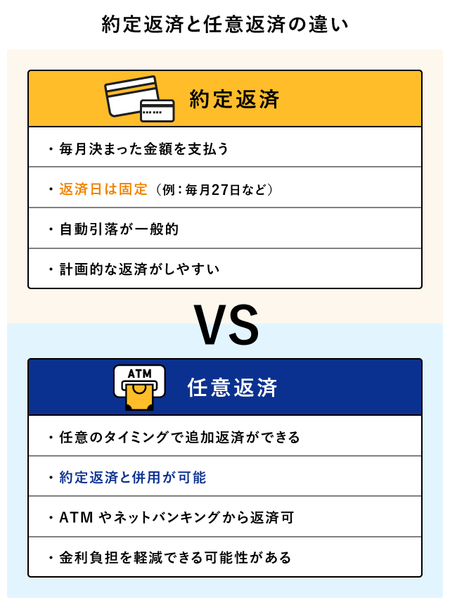 カードローンの返済には、大きく分けて「約定返済」と「任意返済」の2種類があります。